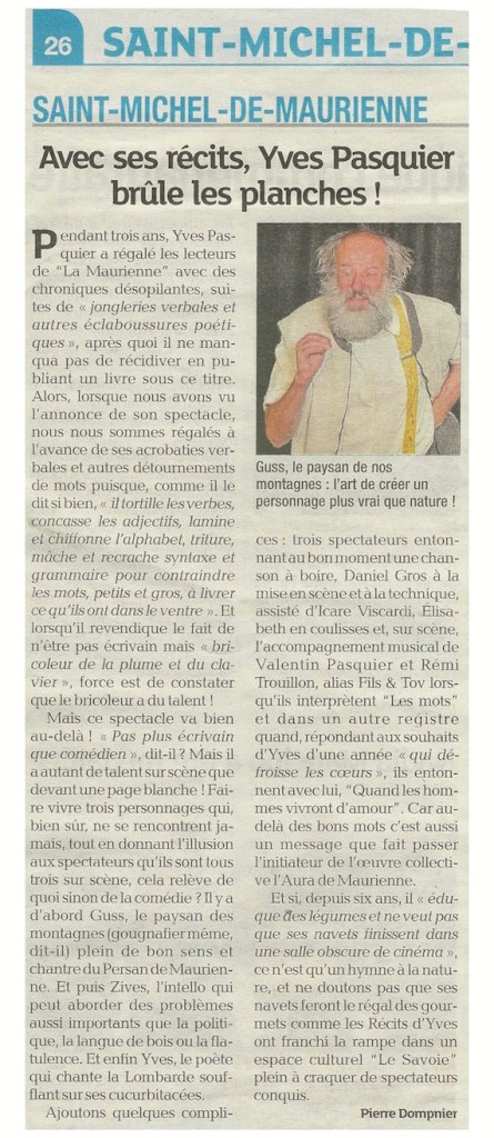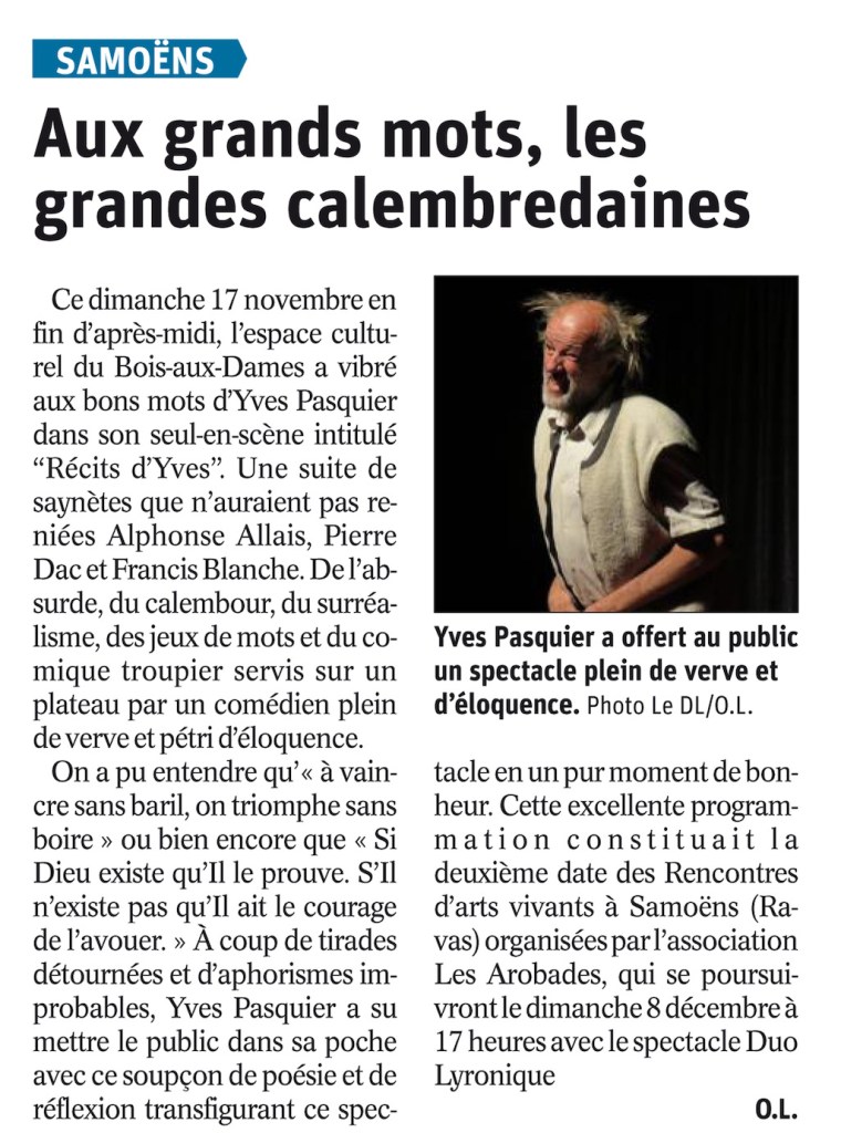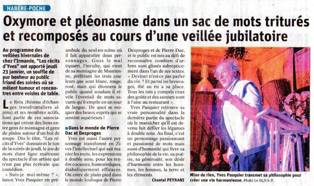 « Récits d’Yves », spectacle de jongleries verbales sarcastiques poétiques et humoristiques dont la musique parfois grinçante est un hymne à la nature et une invitation à la joie. Durée : 1h30